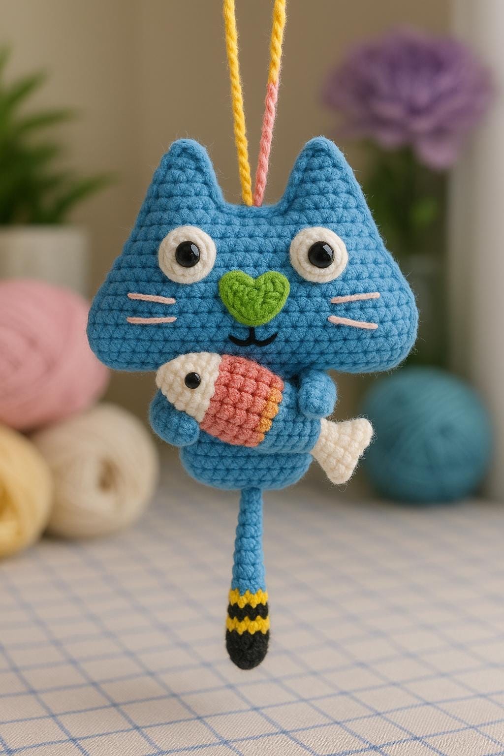 Picture a cheeky yellow cat mid-leap, clutching its favorite fishy friend—my original Amigurumi design brings this whimsical cat-and-prey duo to life as a delightful hanging charm! Perfect for dangling from your rearview mirror, backpack, or nursery mobile, this playful pair adds a splash of feline fun and aquatic adventure to your day.