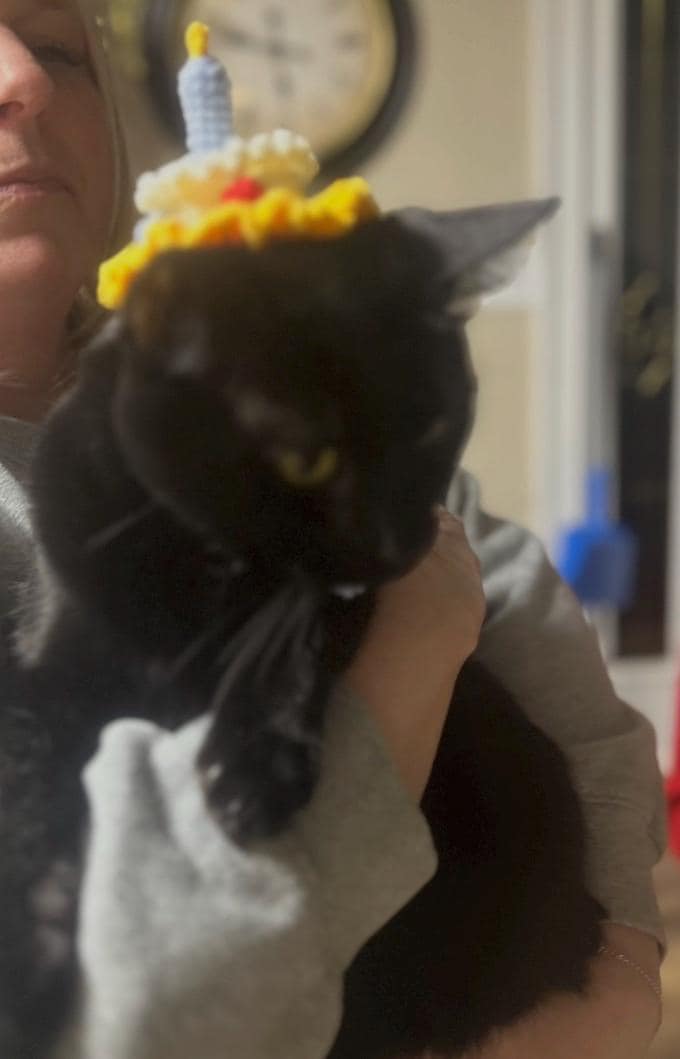 Celebrate your cat’s special day with this adorable handmade crochet birthday cake hat!