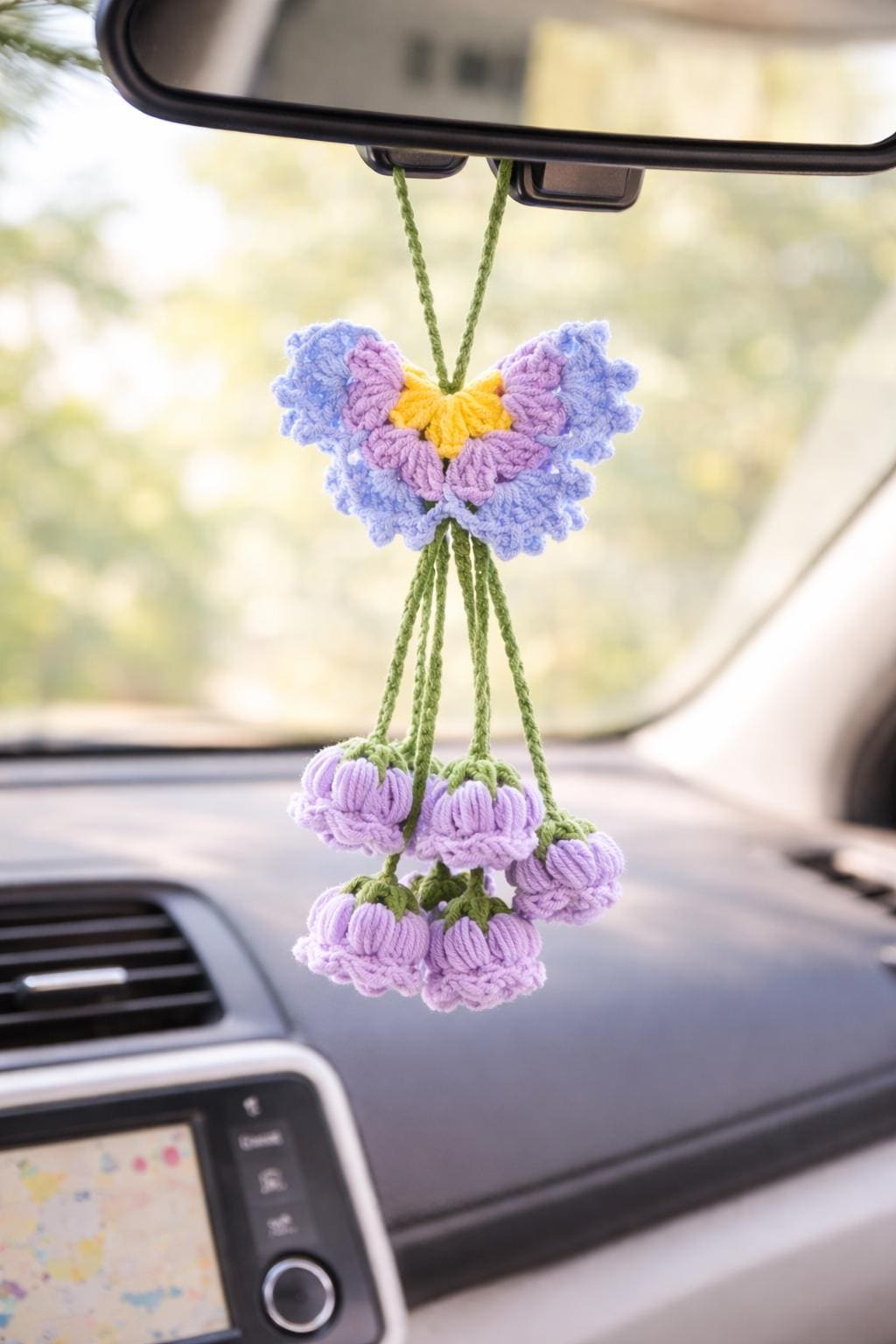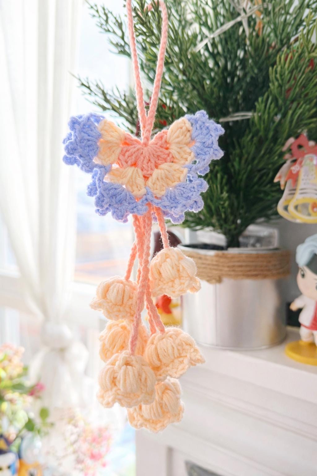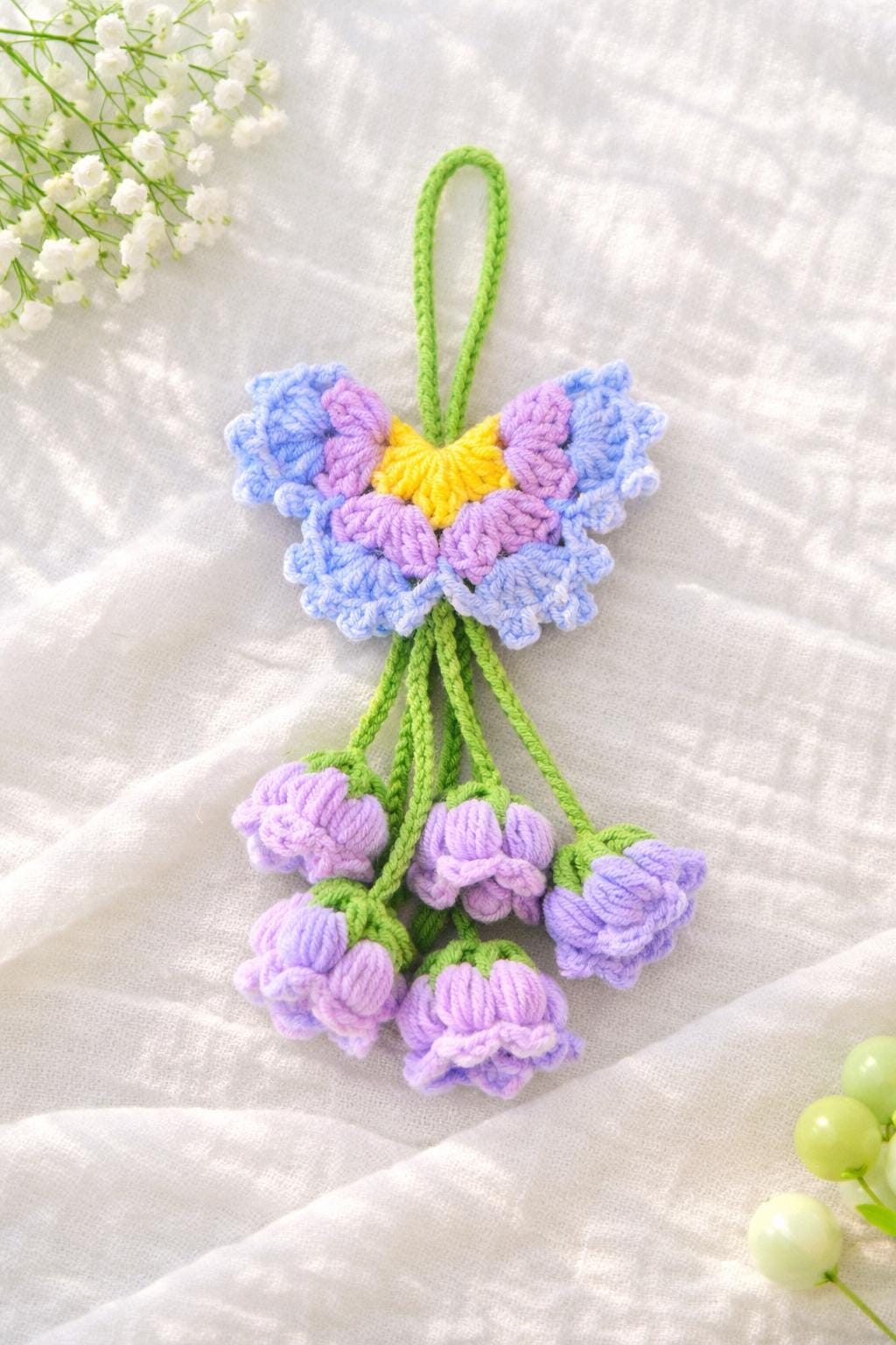 Bring a touch of softness and whimsy to your space with this handmade crochet Butterfly Lily of the Valley charm.