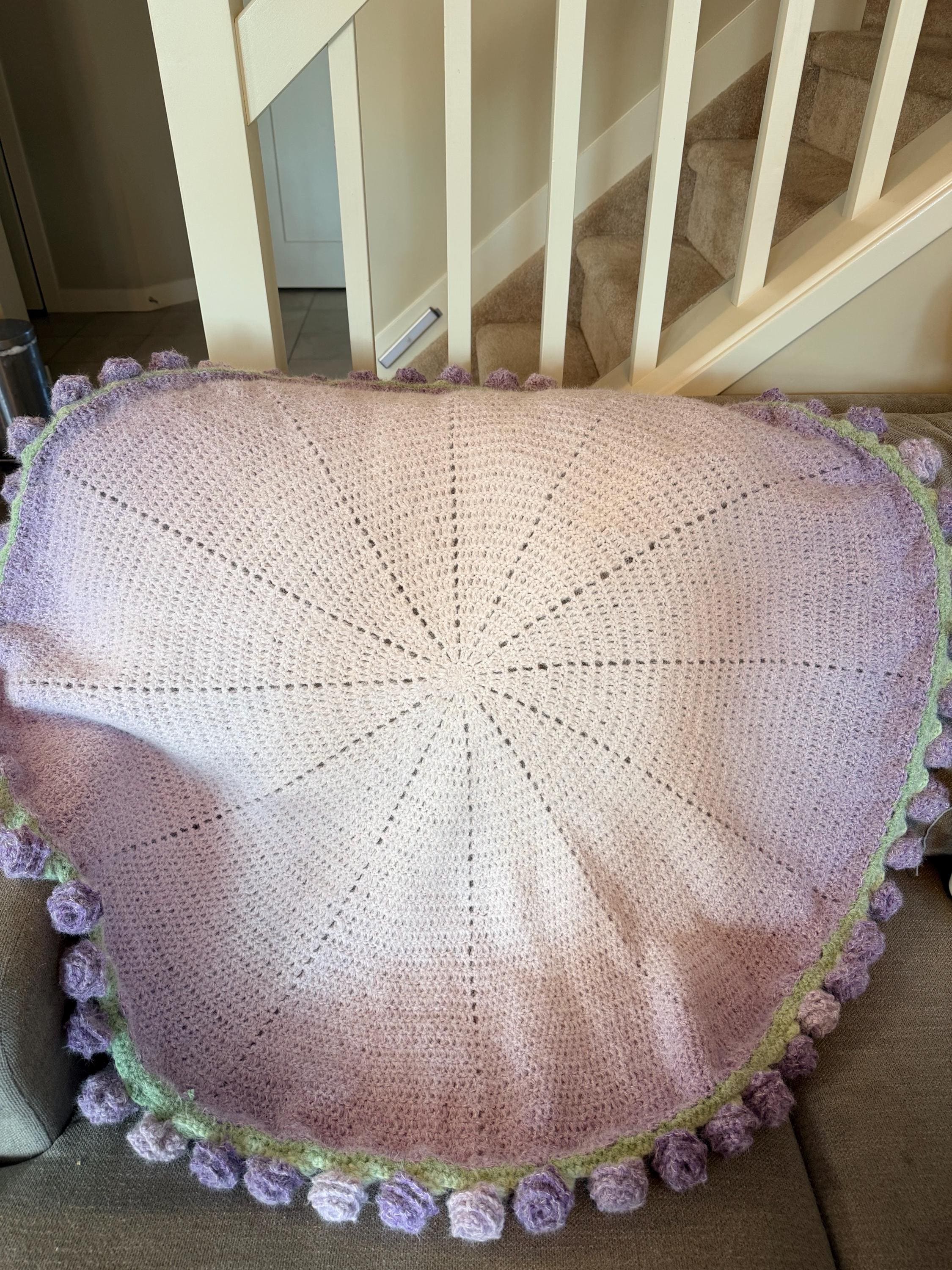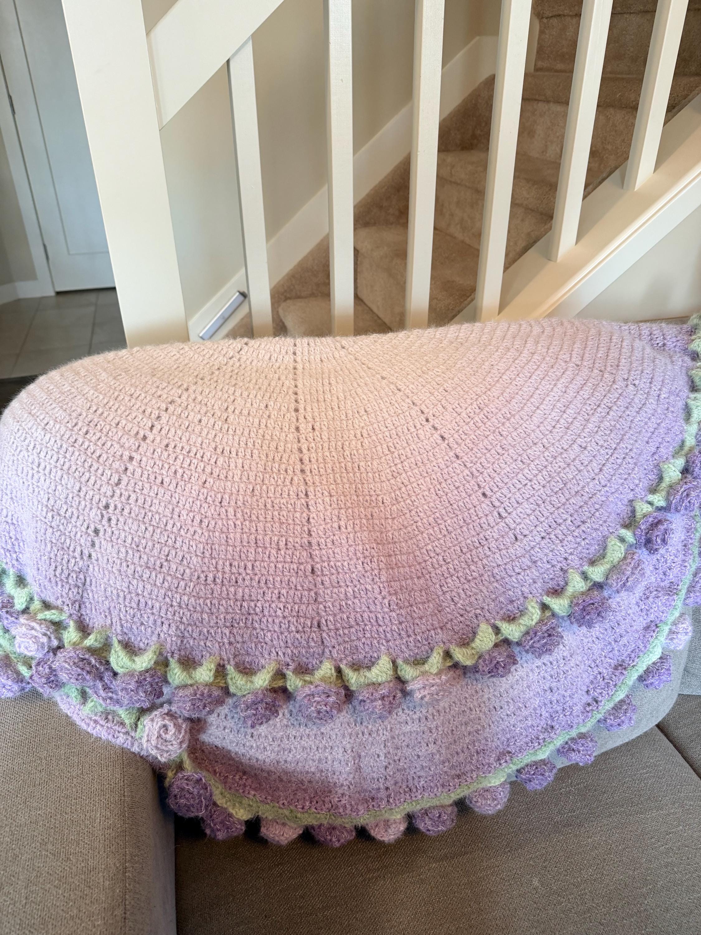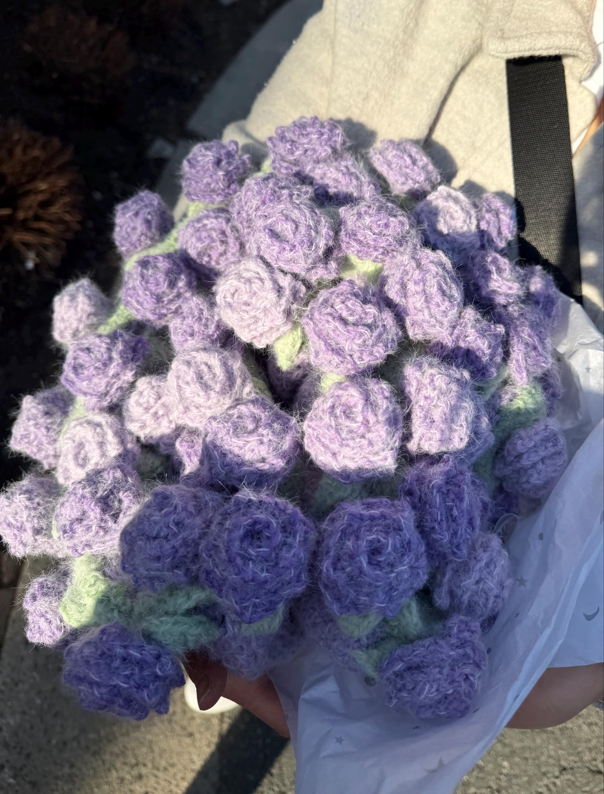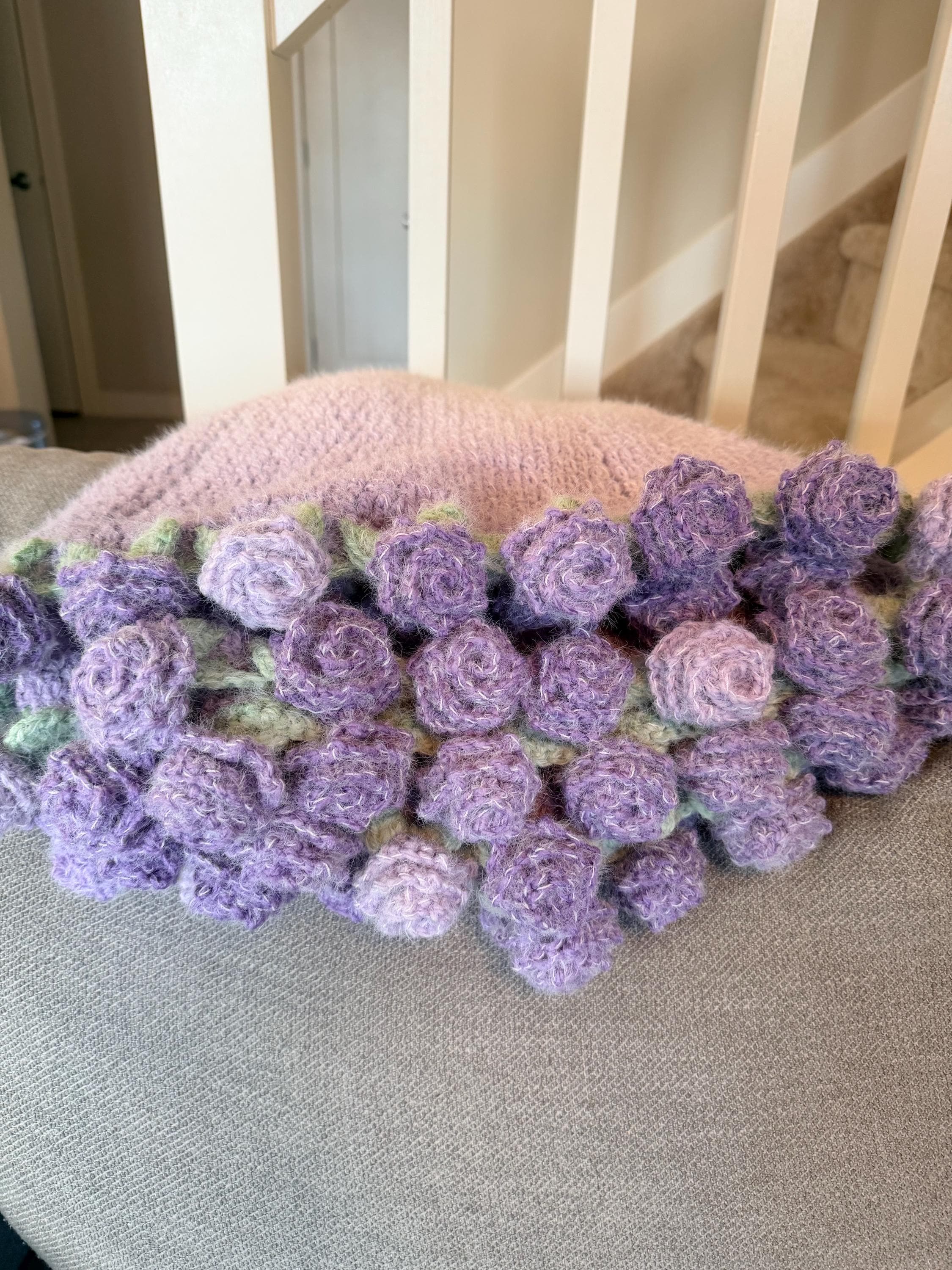 This handmade Rose Garden Crochet Blanket features 60+ individually crocheted 3D roses stitched onto a dreamy purple gradient, creating a soft, romantic, one-of-a-kind piece you won’t find anywhere else.