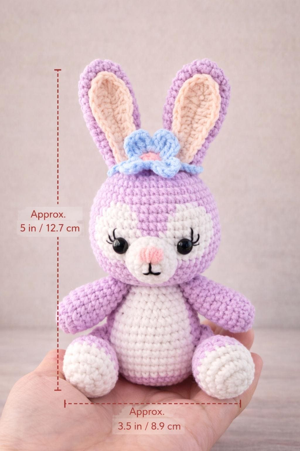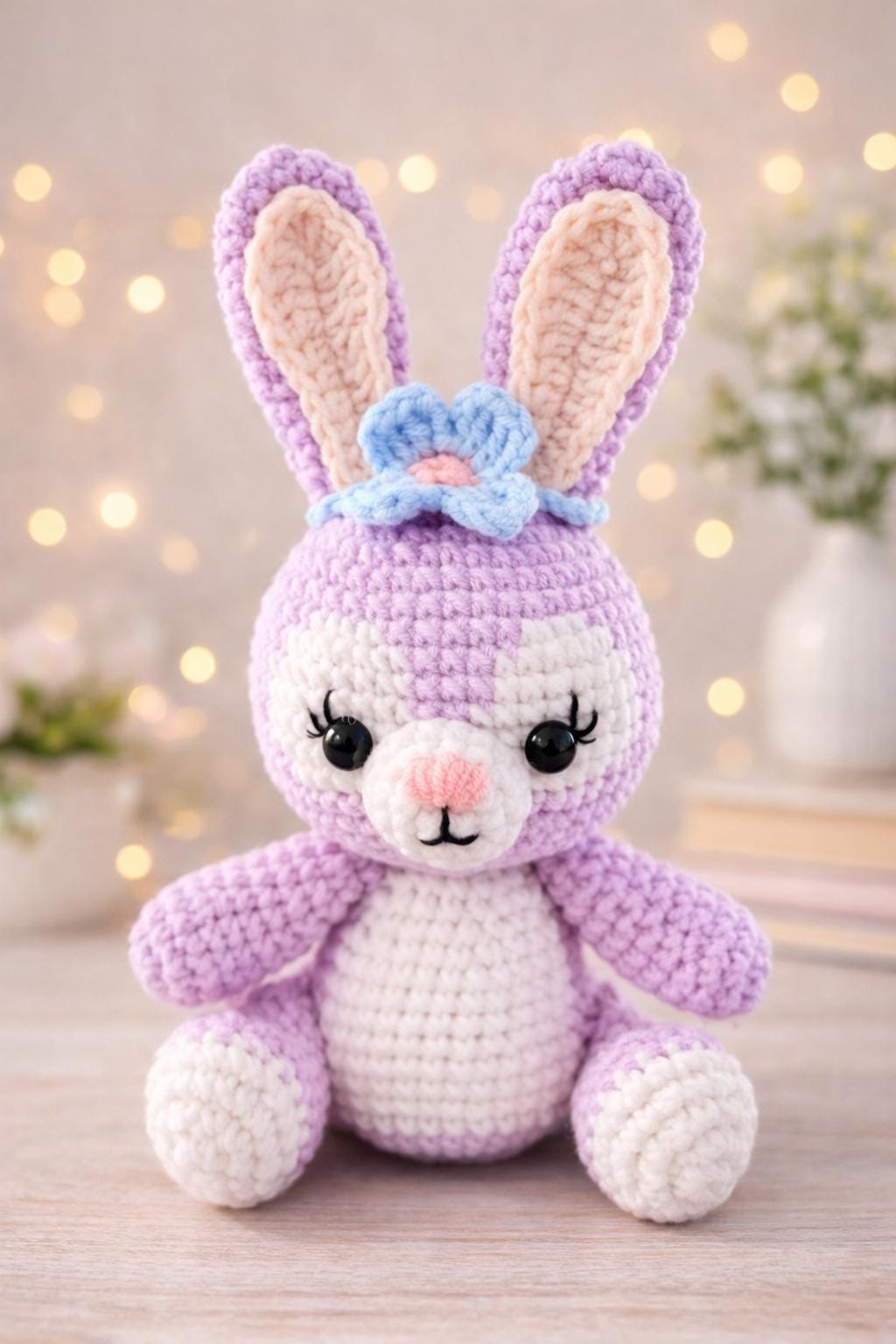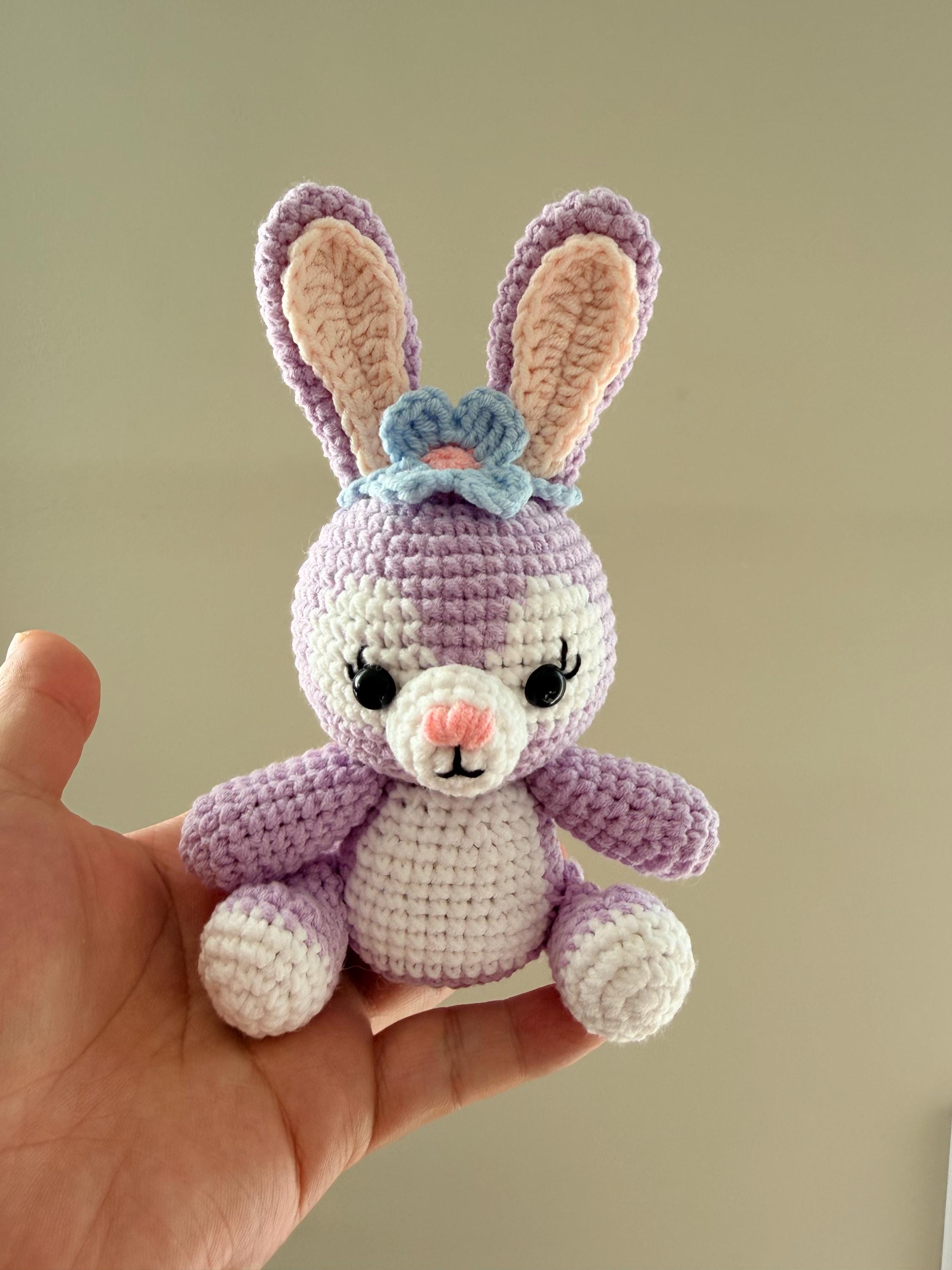 This adorable handmade bunny is carefully crocheted with soft yarn in a gentle lavender and white color palette, finished with sweet little details like long floppy ears, a tiny flower headpiece, and an embroidered nose. Its soft pastel look makes it perfect for nursery decor, gifting, or simply adding a cozy handmade touch to your space.
