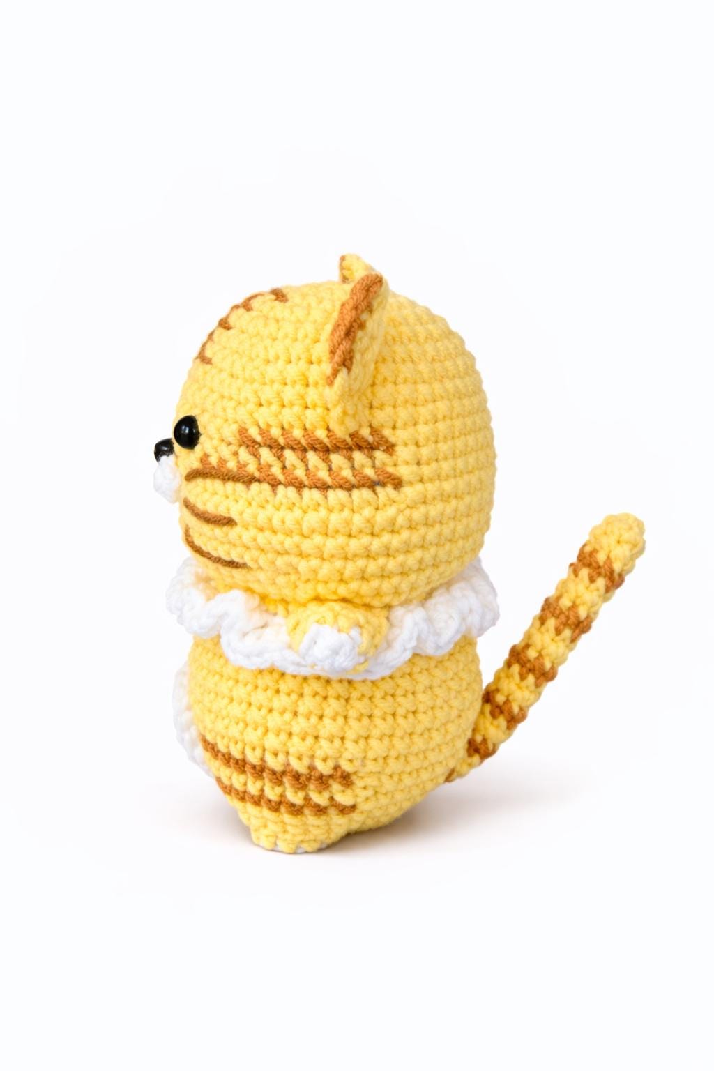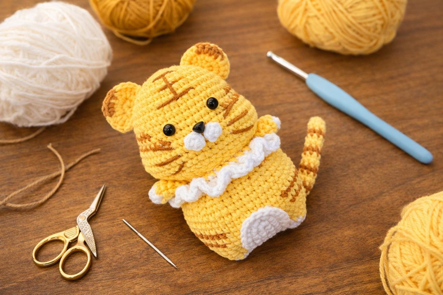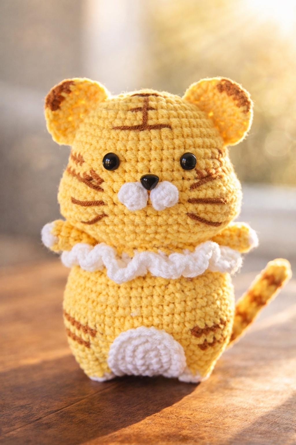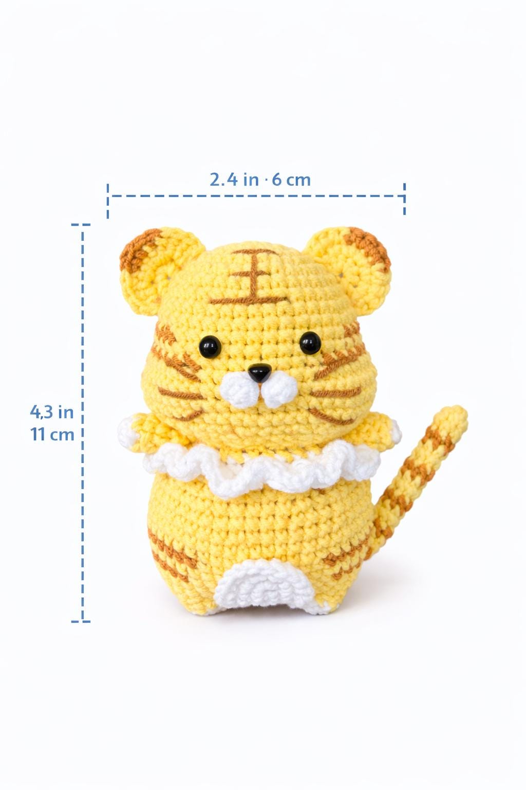 Carefully crocheted with soft yarn and finished with lovely little details, this tiger features a warm yellow body, cute embroidered stripes, tiny rounded ears, a sweet little face, and a delicate white ruffle collar that makes it even more special. Its cheerful look makes it a wonderful gift, collectible, or cozy decor piece for a nursery, desk, or shelf.